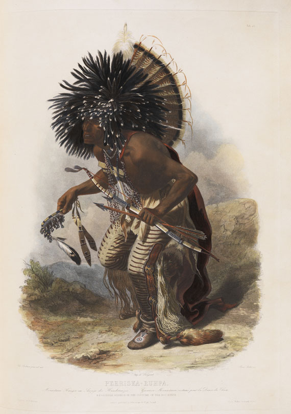 3 volumes. First edition. The most famous German work about the American West and the Indians of the Plains. With 48 aquatinta plates and 33 plates, mostly in aquatint (so-called vignettes), completely colored; furthermore in the text volumes 1 engr. folding map, 1 lithogr. plan, 1 folding diagram and numerous woodcuts in text. Contemp. half calf (plates) and new half calf (text). - Lacking 1 lithogr. plate in text. Text volumes clean, only at the beginning and the end slightly browned, folding map detached. Plates partly with monor staining in the margins (not affecting illustration) and with minim. marginal defects (1 plate stronger stained in the margins and with small repaired tears), 1 plate with marginal tear. Covers slightly rubbed, edges of plate volume somewhat scraped. Altogether broad margined and fine copy of this beautiful book on Indians.