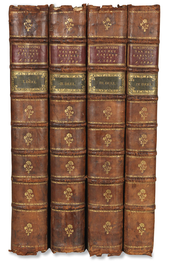 Seba, Albertus, Locupletissimi rerum naturalium thesauri accurata descriptio. 4 Bde. Mit gest. Frontispiz, gest. Porträt des Autors von J. Houbraken nach J. M. Quinkhard, 4 gest. Titel- und 6 gest. Textvignetten sowie 449 Kupfertafeln , davon 174 doppelblattgroß. Amsterdam, J. Wetsteen, W. Smith, und Jannsonius van Waesberge (Bde. 1 und 2), Janssonius van Waesberge (Bd. 3), und H. C. Arksteus, H. Merkus and P. Schouten (Bd. 4) 1734-65. Zeitgenöss. HLdr. mit 2 farb. RSch. und floraler RVerg. 55 : 36 cm.