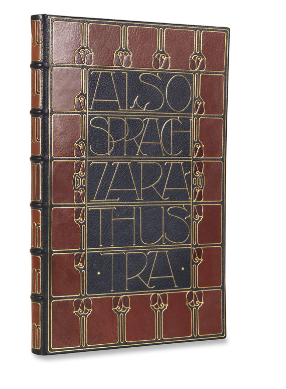 Friedrich Nietzsche's main work, one of the most important philosophical texts of Modernism. This book set standards in Art Noveau book illustration. The signed master binding from Otto Dorfner after a design by Henry van de Velde is a highlight in 20th century binding art: Dark blue morocco with lavish leather applications in two different shades of red, each with gilt borders; gilt-lettered title in narrow majuscules in the deep blue center panel on thefrontboard, top edge gilt and brown endpapers; front inner edge signed "V. D. VELDE INV. DORFNER EX. WEIMAR 16" in gilt-tooling. In a book case in dark blue half morocco with gilt lettering on spine. With ornamentally illustrated double title, title vignette and 4 ornamental half titles as well as head and tail pieces (partly in gold) by Henry van de Velde. - Inside just slightly stained, all in all a fine, clean and well-preserved copy. The binding was skillfully restored by Ireen Kranz, Melbeck: just a few carefully executed mended spots on red leather applications and the gilt borders. All in all a wonderful and well-reserved book.