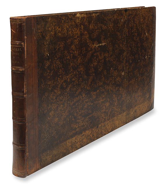 One of the early Roman editions of the Vedute di Roma. Described by Hind as a perfect state. Magnificent fine-drawn prints of very good quality. On very strong handmade paper with Fleur-de-Lys watermark. The plates are mostly marked with Piranesi's address: Presso l'Autore a Strada Felice nel Palazzo Tomati .. On numerous sheets the watermark characteristic of the third edition with the stylized lily in a double circle (Hind Wz. No. 39). - With engr. title, engr. frontispiece and 89 copperplates (of 135) = plates 1-91 (including title and frontispiece), bound differently from Hind. 19th century half-calf with gilt lettering and some gilding on spine. 55 : 76.5 cm. - Plates on reverse partly with slight abrasion of paint, 4 plates loosened, 1 plate with a marginal tear. Binding slightly rubbed, extremities of spine partly torn. Overall a nice, wide-margined copy with smoothed center folds.